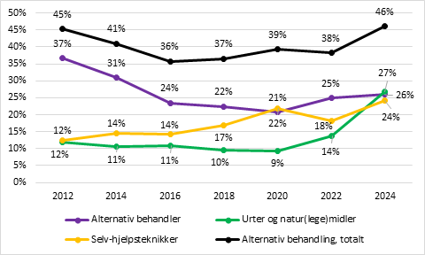 I 2012 svarte 45 % av deltakerne at de har brukt minst én form for alternativ behandling de siste 12 månedene. I 2016 falt andelen til 36 % og vi tenkte at bruken i befolkningen var på vei ned, men så snudde denne trenden igjen. I 2024 var bruken steget til 46 %, nesten identisk med nivået tolv år tidligere.