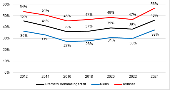 Kvinner benytter seg i større grad av alternativ behandling enn menn, og denne forskjellen har holdt seg uendret over tid. I 2012 rapporterte 36 % av mennene og 54 % av kvinnene at de hadde brukt alternativ behandling, mot 38 % av mennene og 56 % av kvinnene i 2024: